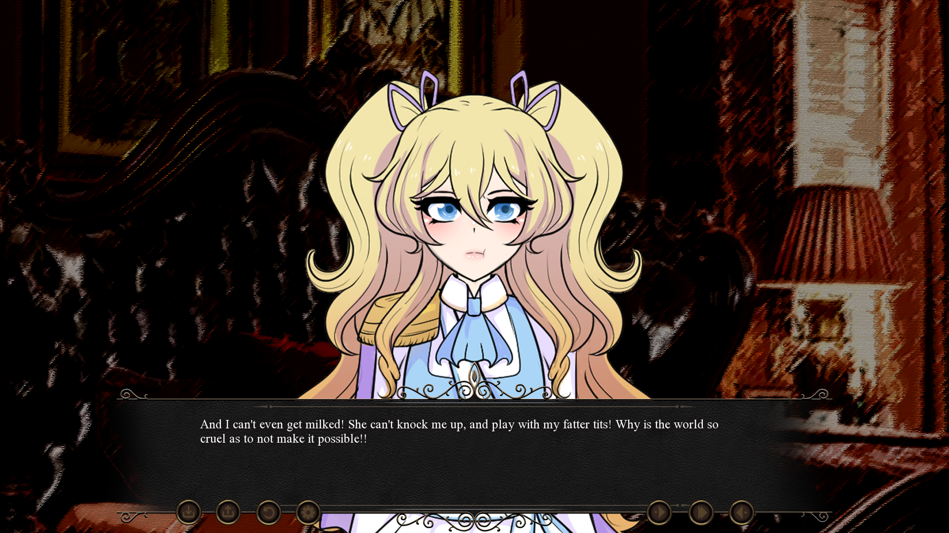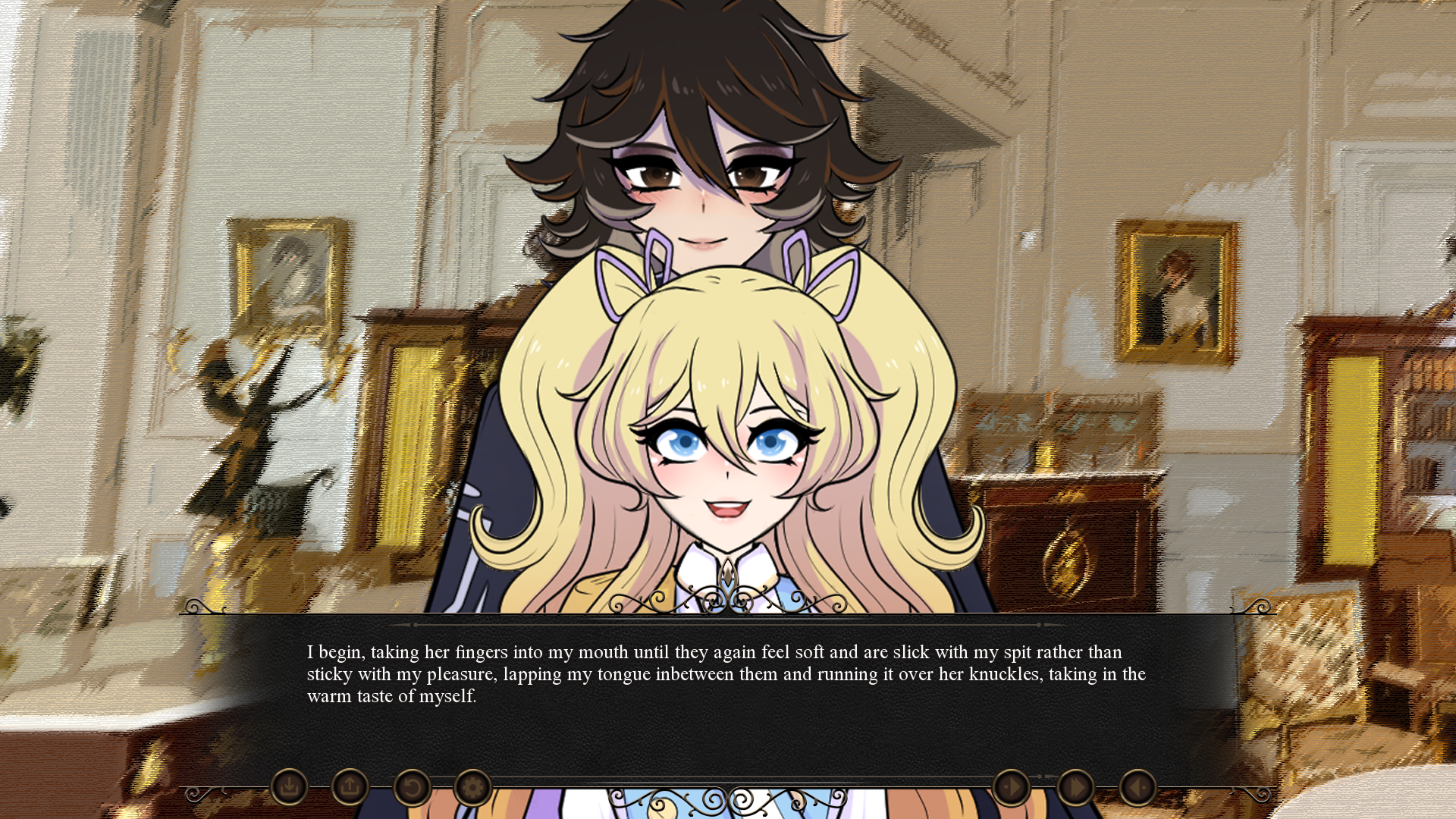 From there, the VN goes pretty full force on the eroticism until the end. I think that the moments where the two royals need to have some decorum provides nice moments to recollect and breathe until the next sex scene. I think that the idea of a kind of social horror in the sense of standard hierarchies of power being utterly waylaid so an empress can go doggy mode and get fucked like a hound in heat is an amusing one. "This visual novel would make the head of a medieval peasant explode" type of energy.
